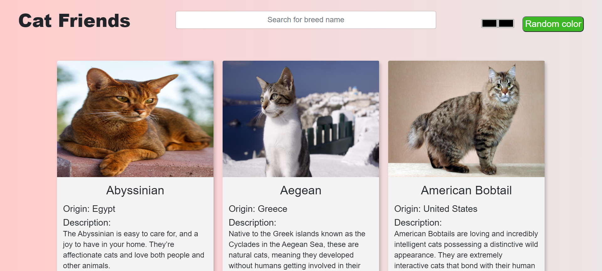 This is a react app. Anyone can search for a cat by its breed name. Background color can be changed. Random gradient color will be generated by clicking a button called 'Random color'