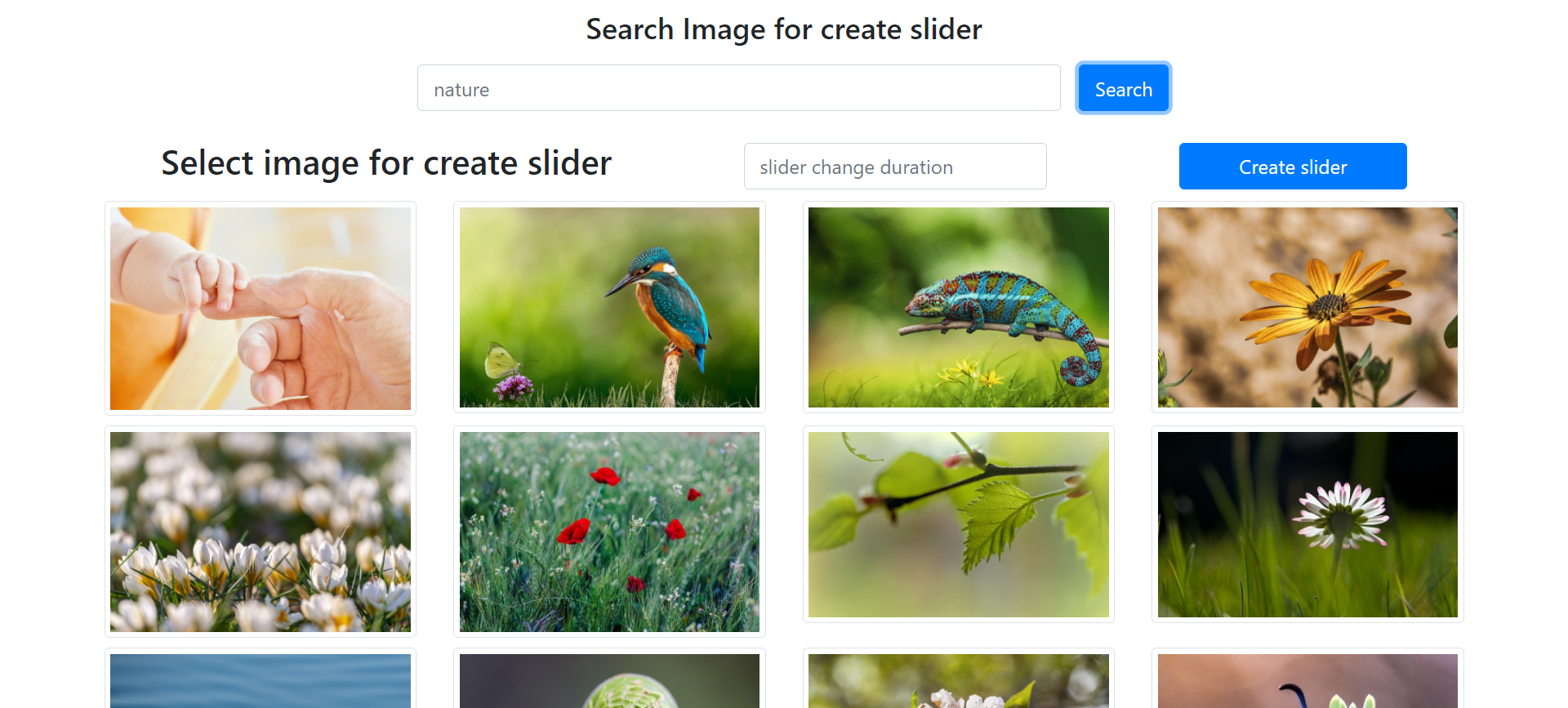 You have to search for wallpaper by its category name and you will get all the wallpaper related to that name. If search input field is empty and you click the search , you will get all the wallpaper available in our collection. You can select some images and make a wallpaper slider. You can also set the duration for sliding an image.